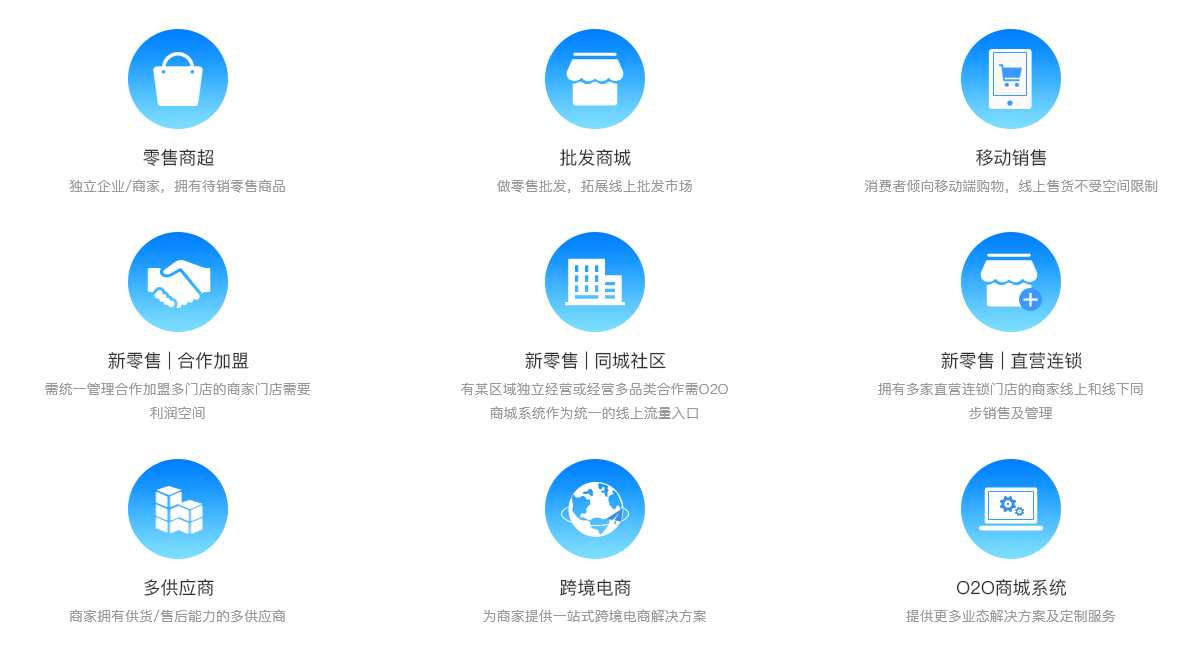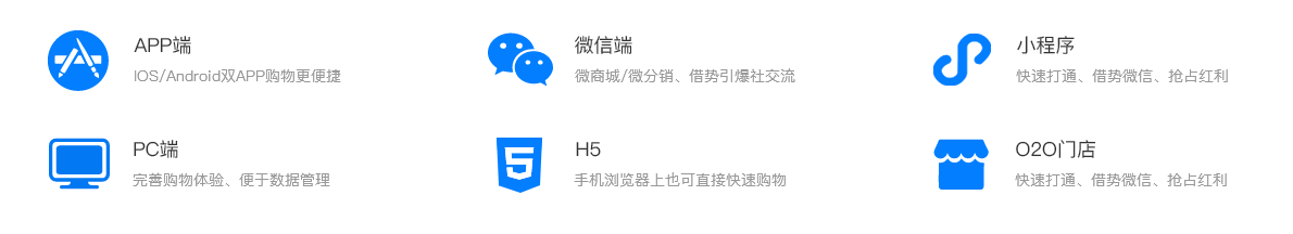多用户商城涵盖主流消费者触点,打通各渠道,数据独立展现,实现一次开店,全终端覆盖,完美实现新零售。